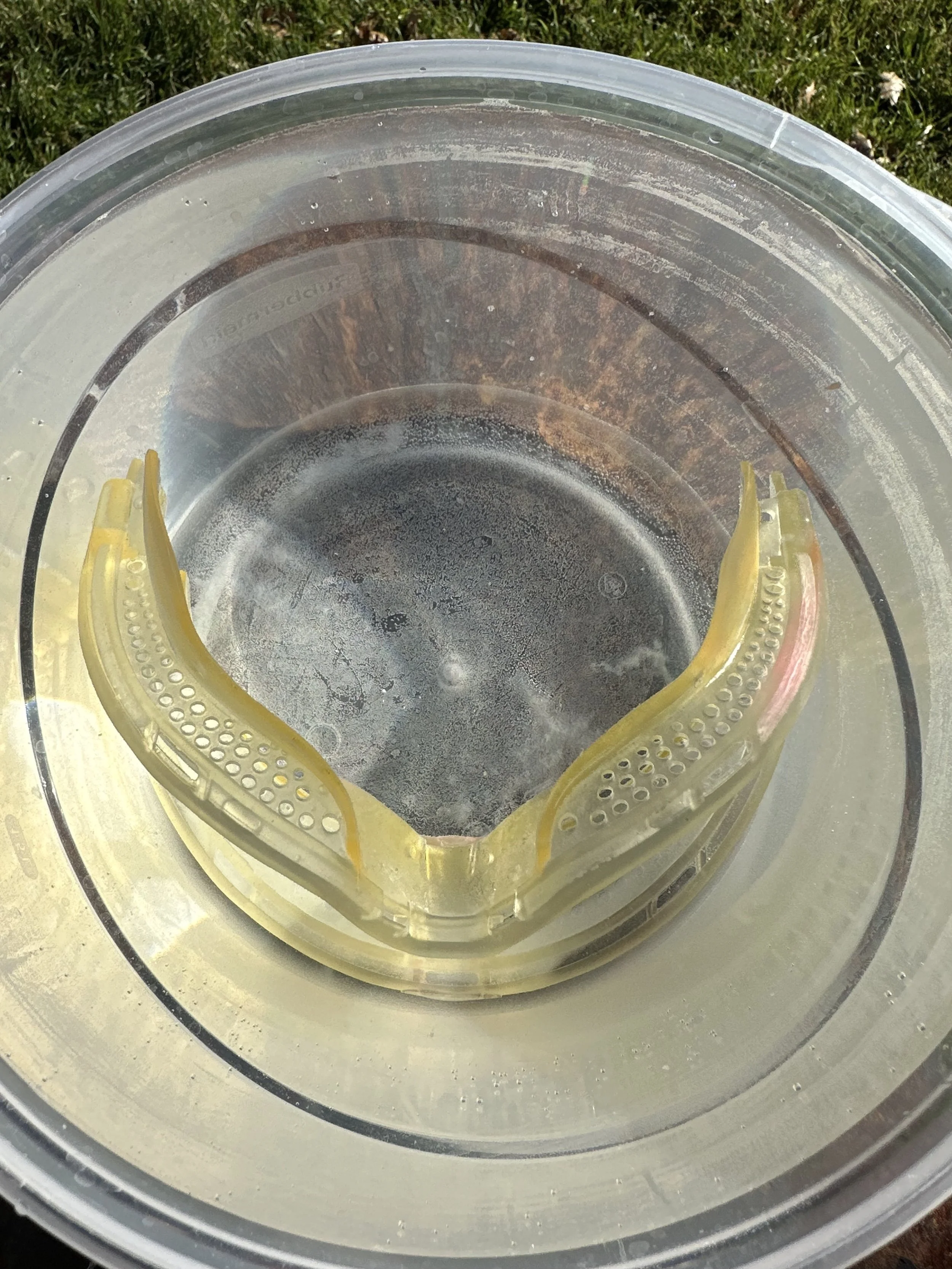 The eye on these frames had a pretty radical pink stain, and the forehead. Also yellowed some. A prime candidate for clarification. (Don’t bother trying with the ears, not gonna happen, at least in my experience, check JT Proflex Facebook groups for potentially different opinions)